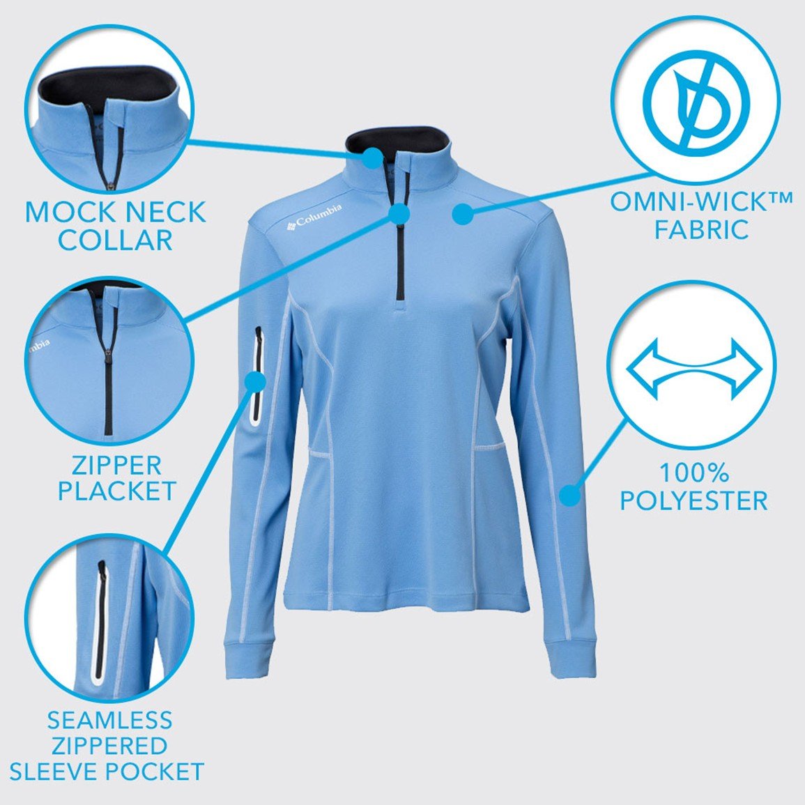 • Zipper placket with mock neck collar for adjustable comfort