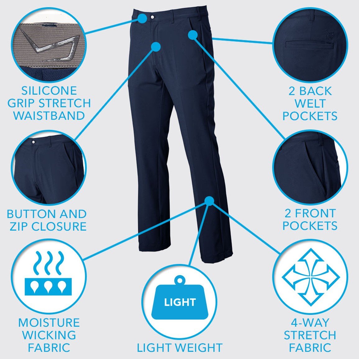 4 Total Pockets - 2 front and 2 back welt pockets provide space for golf accessories and personal items.